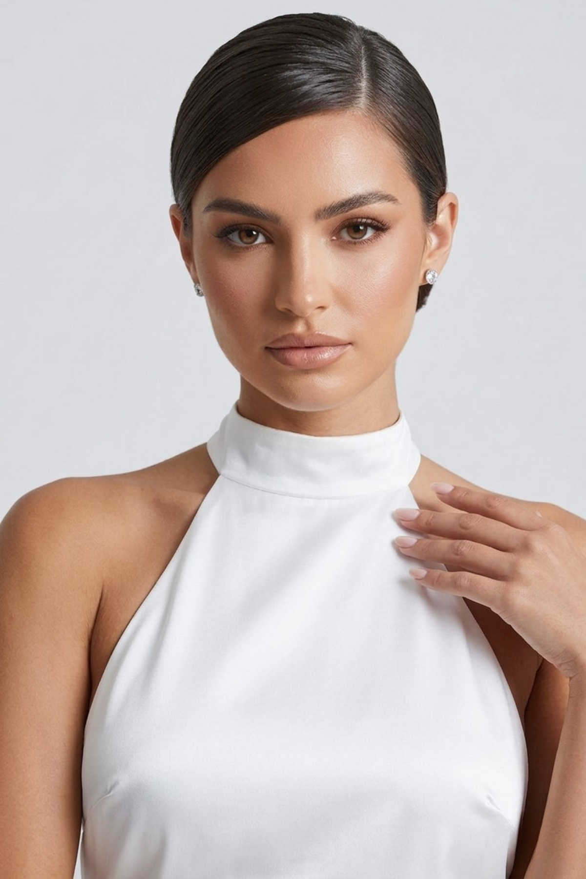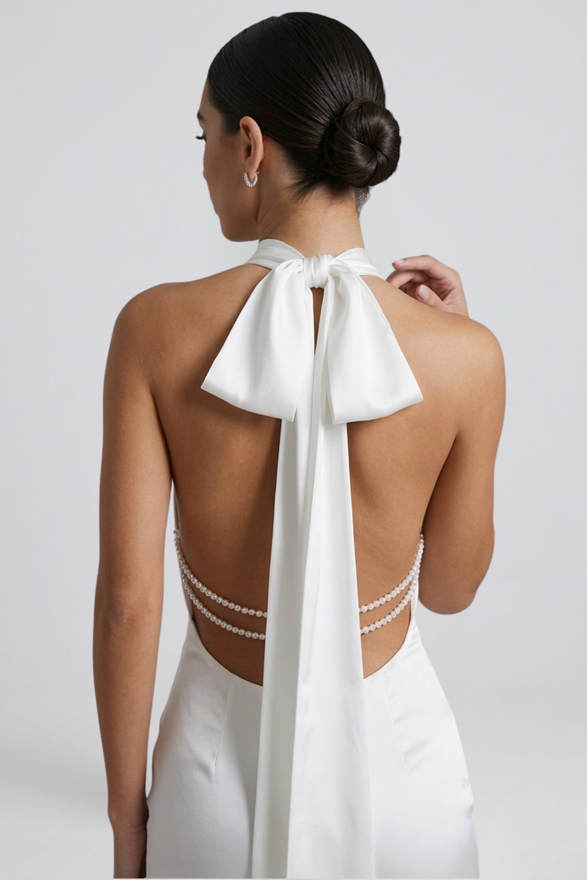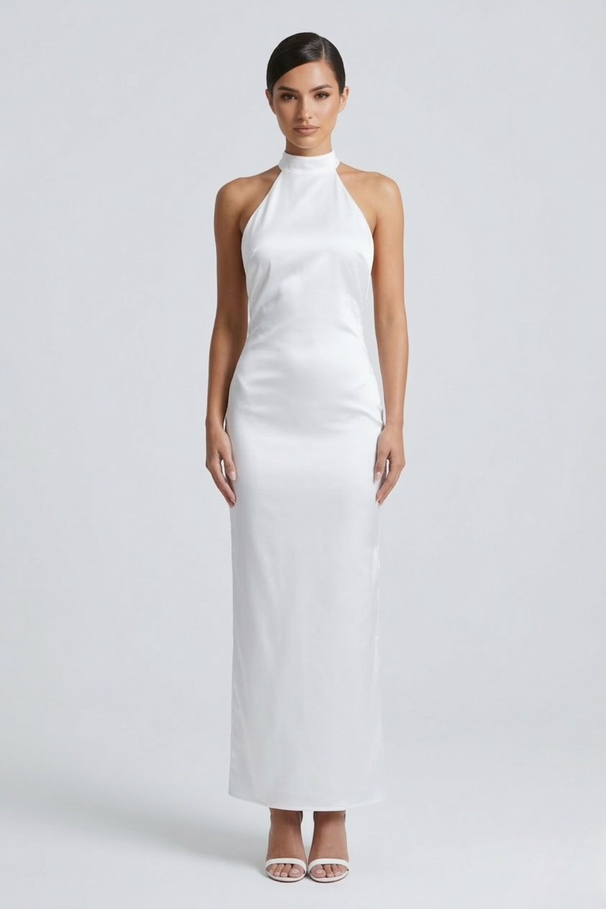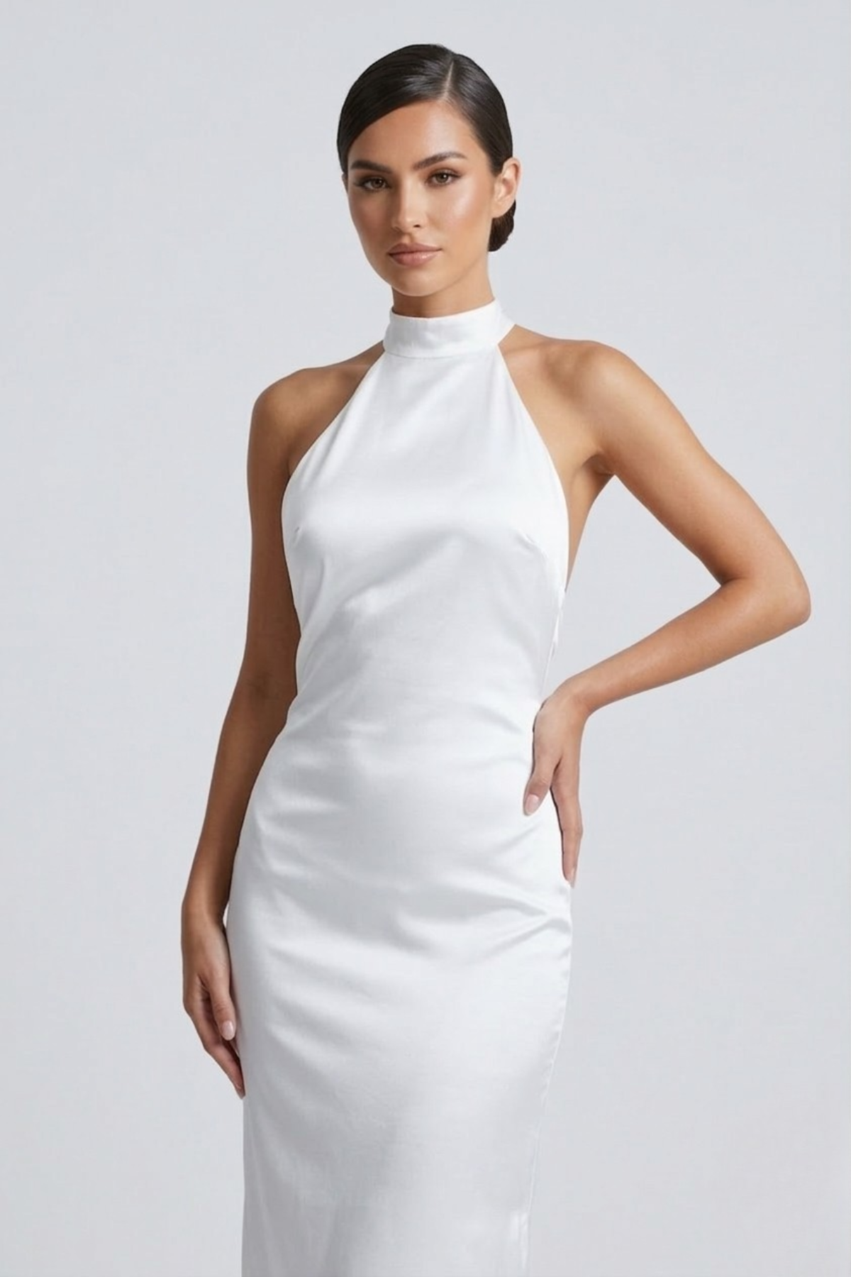 • Décolleté halter et dos nu qui allongent les épaules et le dos, créant une silhouette féminine et confiante sans effort.