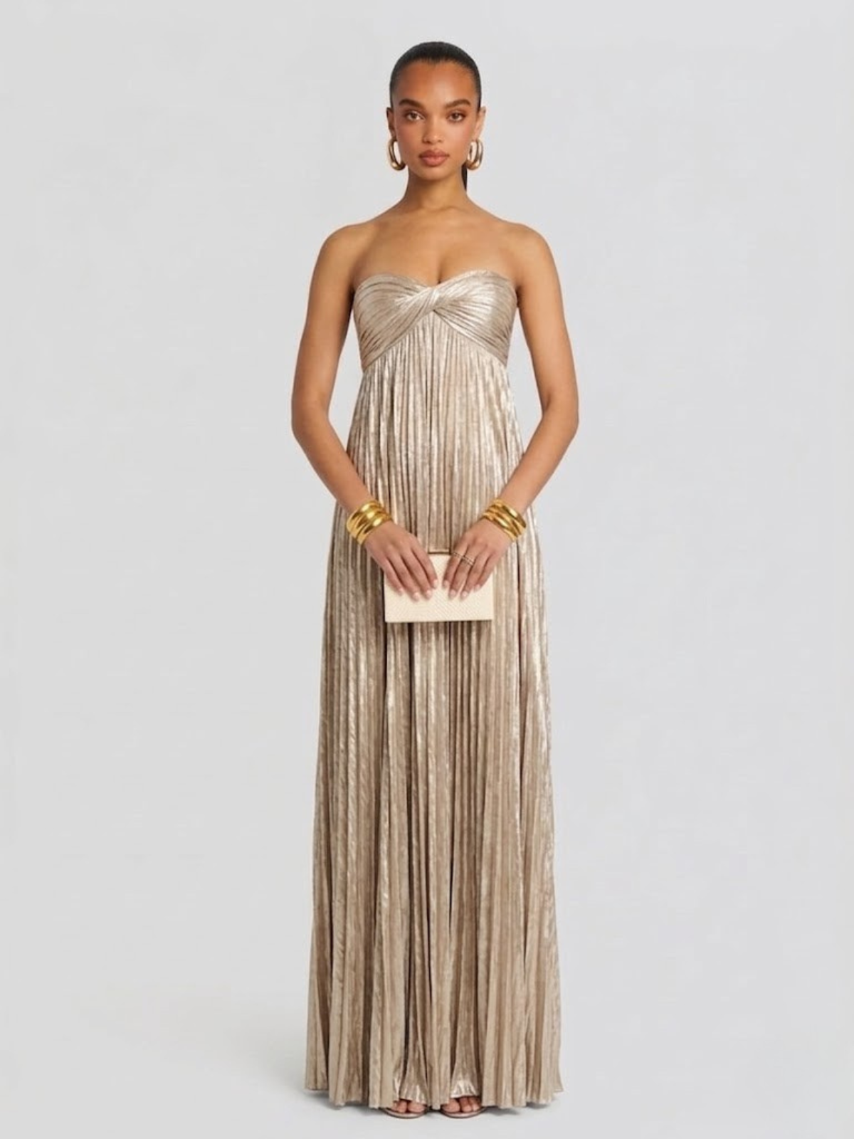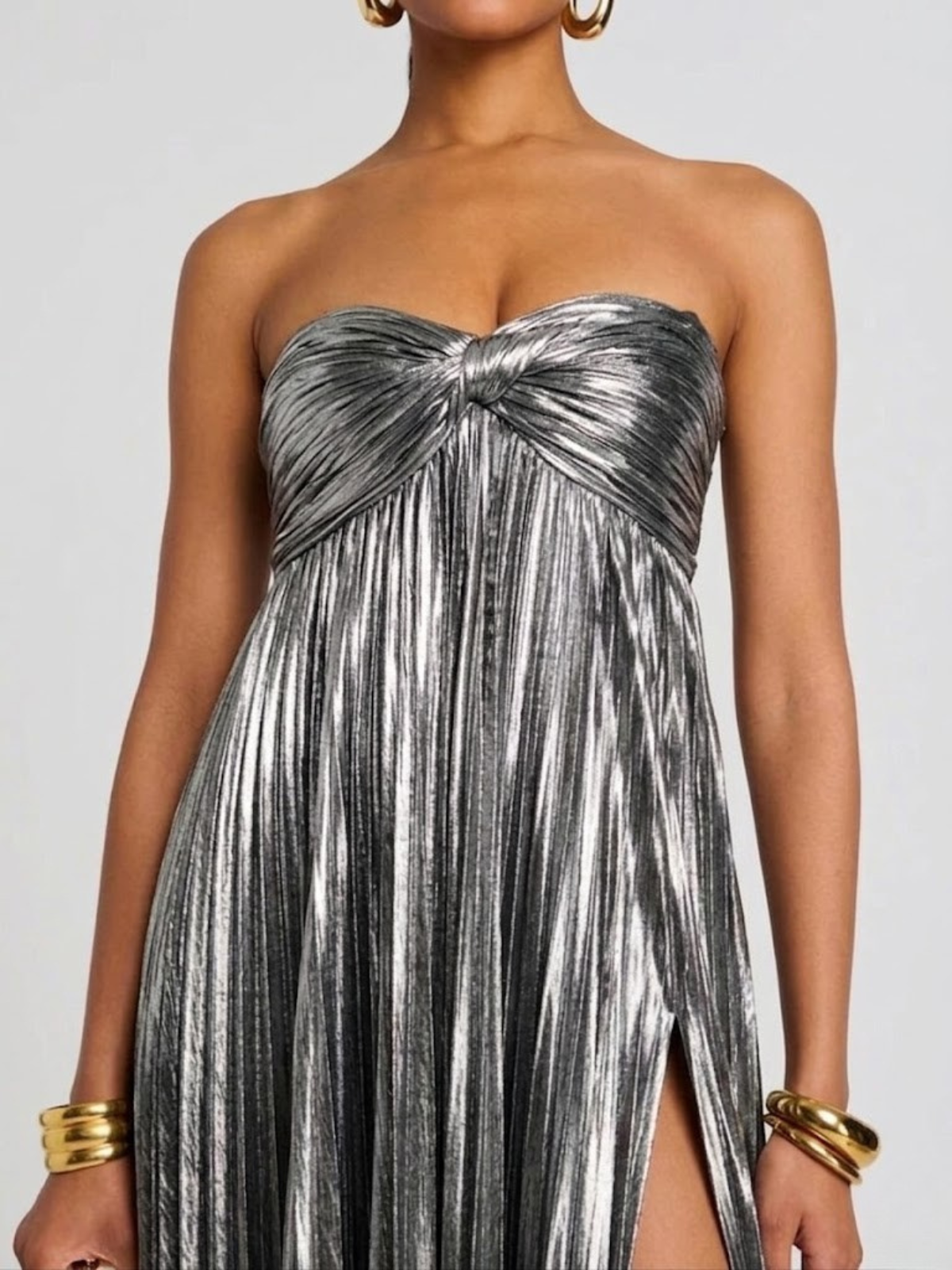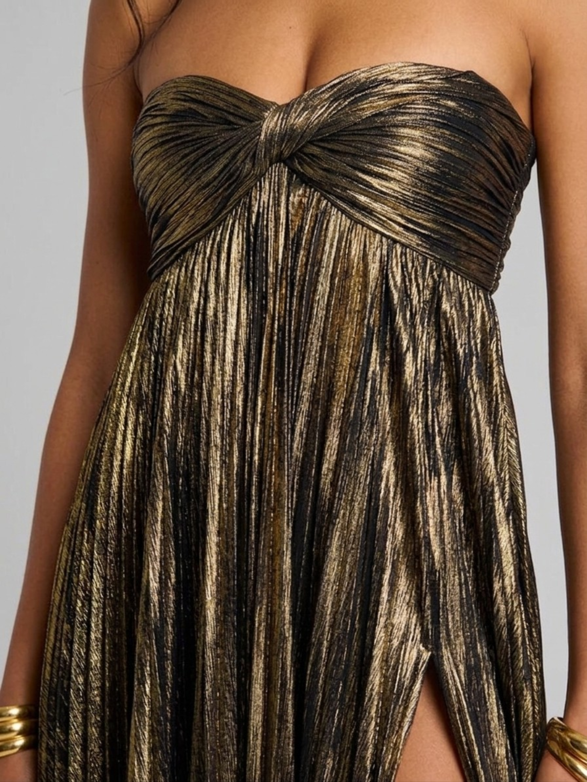 Sa coupe bustier met en valeur le haut du corps et souligne délicatement le décolleté, tandis que la matière métallisée plissée allonge la silhouette avec fluidité. La taille est subtilement définie, laissant tomber une jupe fluide qui accompagne chaque pas avec légèreté. La fente haute dévoile la jambe avec sensualité, apportant une touche glamour parfaitement maîtrisée. Confortable et aérienne, cette robe soirée chic épouse les mouvements tout en offrant un tombé impeccable.