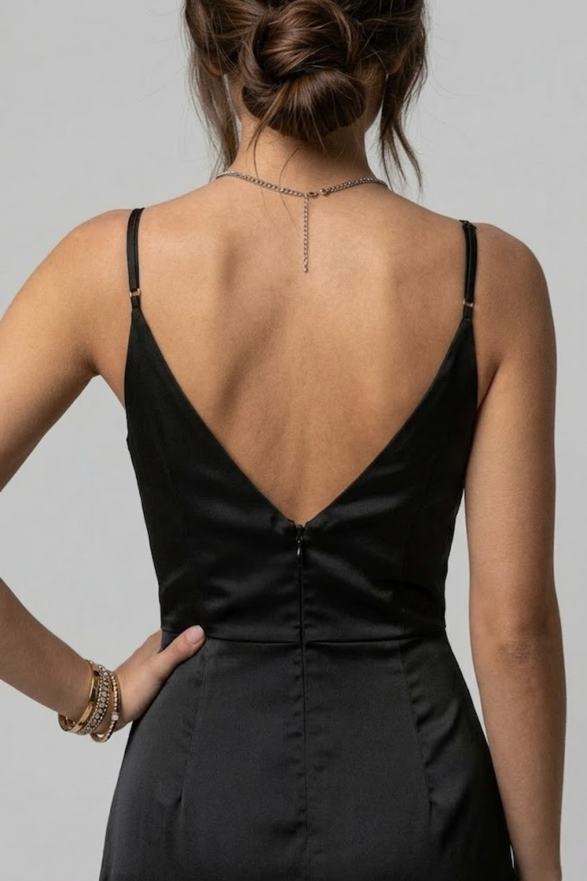 Décolleté en V profond et bretelles fines: encadre le décolleté avec équilibre et sophistication, idéal pour des soirées spéciales.